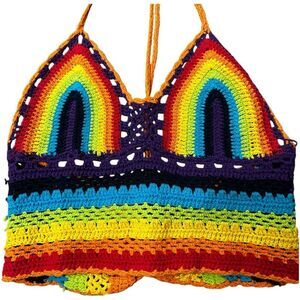 Multicolored Rainbow Halter Cropped Top Size S Hand made Y2K Retro Hippie Festival Inspired