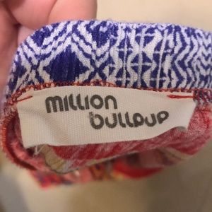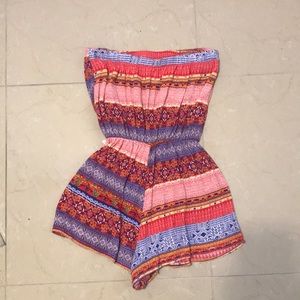 Strapless small romper. Airy material and synched at the waistline. It’s pretty short and there is no size tag but it’s a size small.