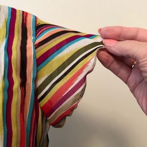 This lovely multicolored blouse buttons down the front. The body has form-fitting accordion style pleats down the front, and is finished with a “skirt” at the bottom. Cap sleeves finish off the look. This 100% polyester top is machine washable.