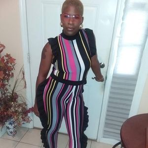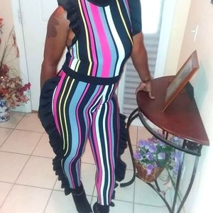 This jumper has little stretch, only worn once. It zips in back, ruffles down legs to to but for a flirty look. The bottom legs are cuffed. Wearable well with a short fitted ankle boot or Cinderella Heels (clear shoes). Fits somewhat high neck. It's perfect for spring/summer events. Very cute on. I worn it to a wedding/reception.