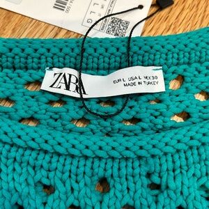 This vibrant teal or deep turquoise green sleeveless top features a knitted or crocheted material with a lattice-like pattern, creating a see-through mesh-like quality. The cropped length and relaxed fit make it a stylish choice for any casual occasion.