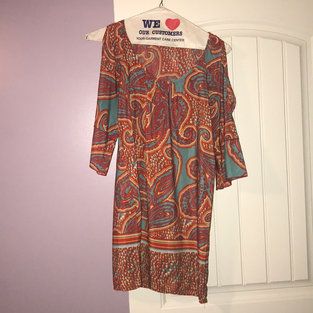 Multicolored lite weight dress with keyhole shoulders.