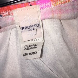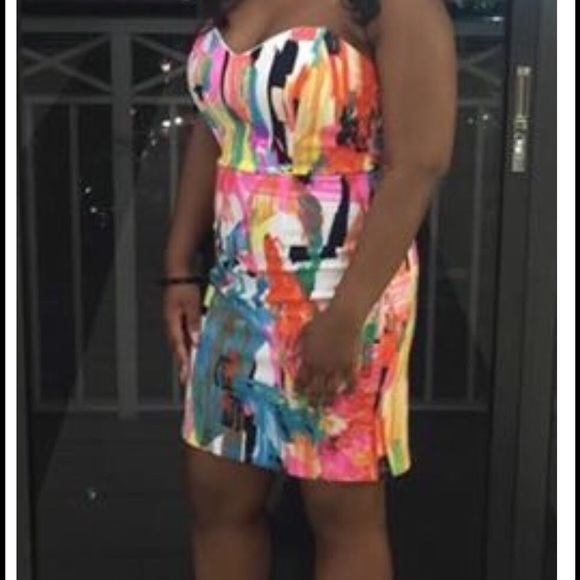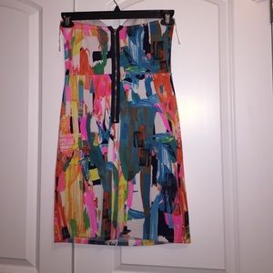 Excellent condition multicolored Strapless dress with sweetheart neckline. Worn once! Has zipper in back. Bought from a boutique. 96% polyester 4% spandex. Size M has vertical underwire up top