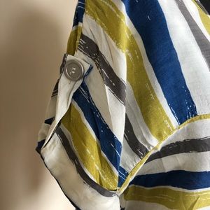 White, green, and blue striped top, cuffed sleeves with button detail, 100% rayon