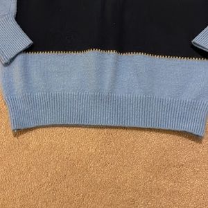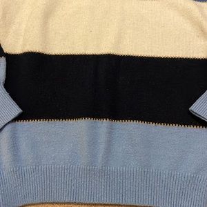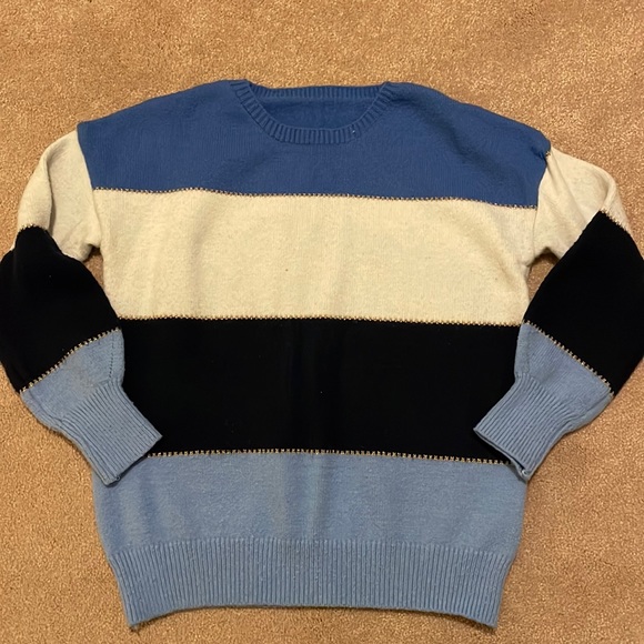 Blue and white multicolored sweater. Very soft and in good condition. Gently worn. Made of 42% Acrylic, 28% nylon and 30% PBT. Perfect for fall and winter days!