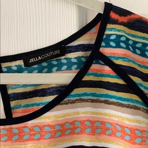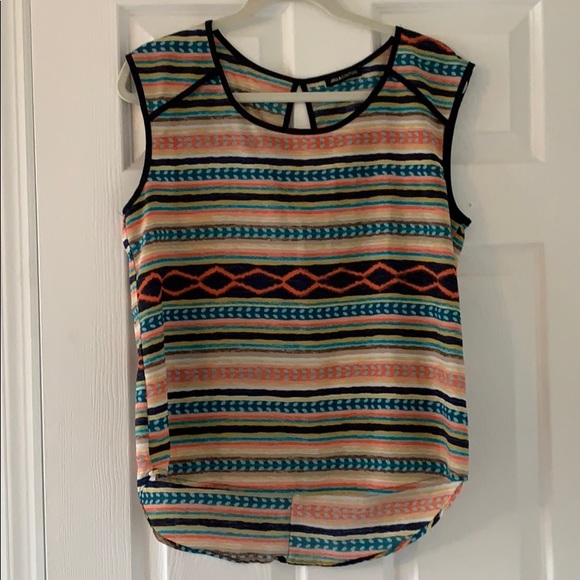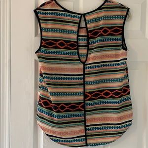 Navy, rust, tan, cream, aqua, teal, salmon, mustard yellow patterned tank.