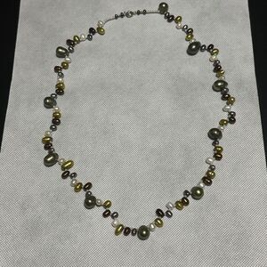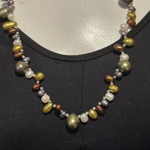 Top drilled teardrop genuine pearl necklace with tahitian, gold, copper, white, and green pearls with white seed beads for spacers and a silver tone spring ring closure.