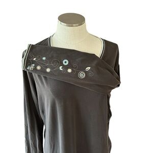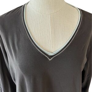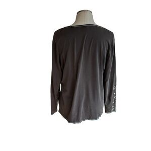 This fitted blouse features a V-neck design with full-length sleeves, made of a soft cotton mix fabric. Look at decorated sleeves.