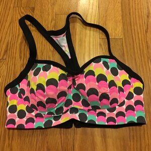 VSX sports bra with multi-colored overlapping dot pattern and black straps.