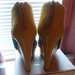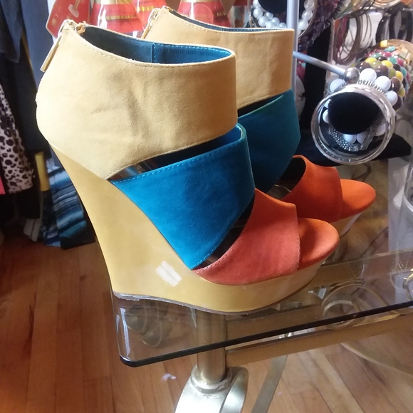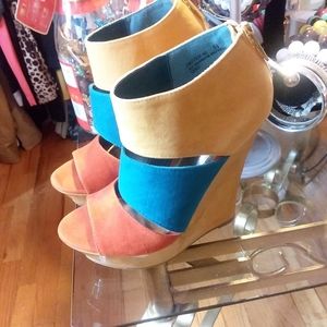 1 Multicolored wedges size 5 1/2 can fit 6. New never been worn. Small imperfection on left shoe as a reult of moving shoes in a box as shown in pictures.