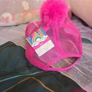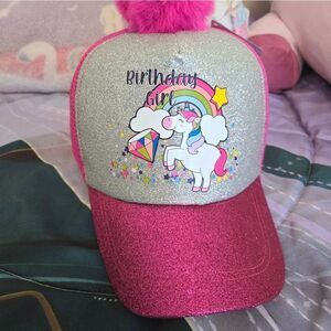 Super cute and creative, birthday girl, unicorn ball cap style hat with glitter sparkles and a pom pom.