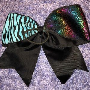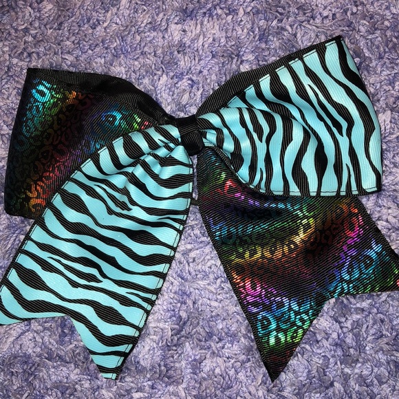 Blue and black zebra print with rainbow cheetah print on the opposite side. Super cute for cheerleading! The hair tie is in perfect condition and there are no marks. Comes from a smoke free household.