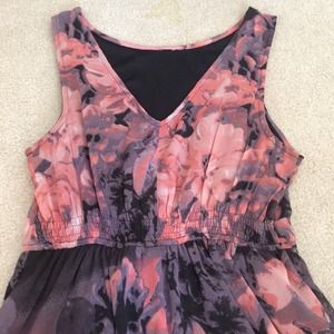 Floral A-line dress featuring corals, dusty purples, white and black. Natural waist with cinching in the black. V back. Fits a little large for me, my measurements are 31-25-33. Feel free to ask any questions on sizing! 😊Never worn.