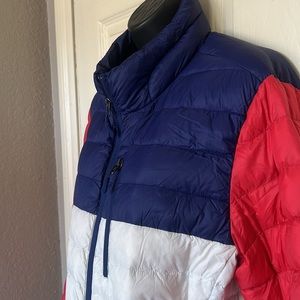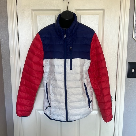 Blue, white and red colored jacket. Will keep you warm and the material is soft. Light stretch