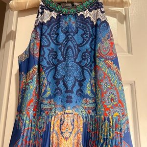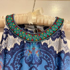 Summertime chic! Wear this gorgeous, silky maxi dress anywhere! A wedding, out to dinner, the sky is the limit. The fabric is lush both in movement and color. The pleated waist and beaded neckline makes this piece special. Worn once.