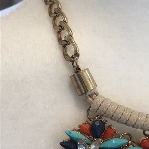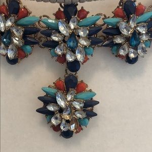 Statement necklace with crystals in clear, turquoise, navy and orange. Adjustable