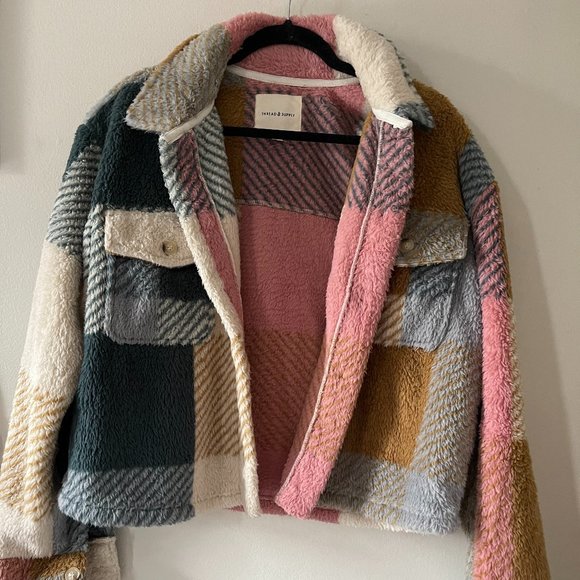 Multi-colored patchwork jacket. 2 breast pockets. Super soft and cozy, but lightweight. Perfect for fall and spring weather. Like new.