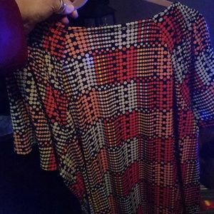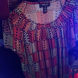 Box like pattern. Ruffle accent at neck line. Great material for work and packing. Doesn't cling doesn't wrinkle. Dress up or down. Versatile piece. Looks good with a Blazer.