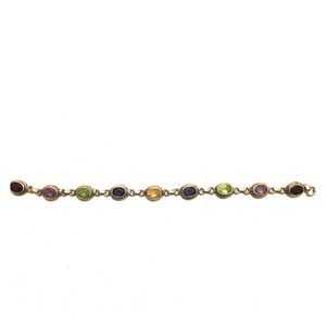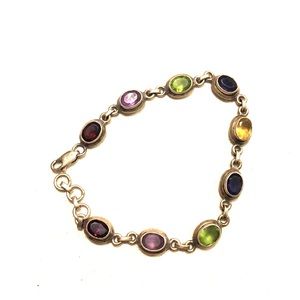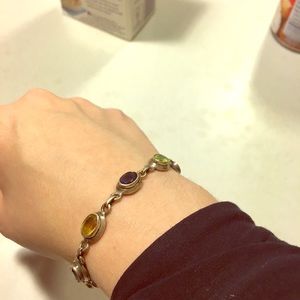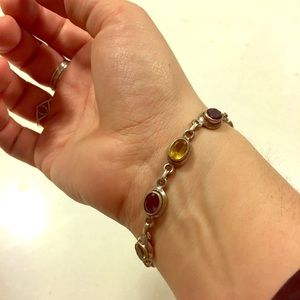 Real silver and multi colored amethyst bracelet. Stones are red, purple, green, blue and yellow. 3 extra chain links for adjustability. Slightly tarnished with age, easily spiffed up.
