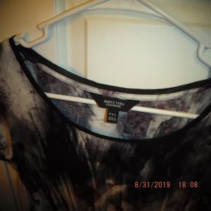 Multi-colored short-sleeved shirt, also has silken wrap around bottom. Nearly new. Colors are : purple, gray, red, white, black.