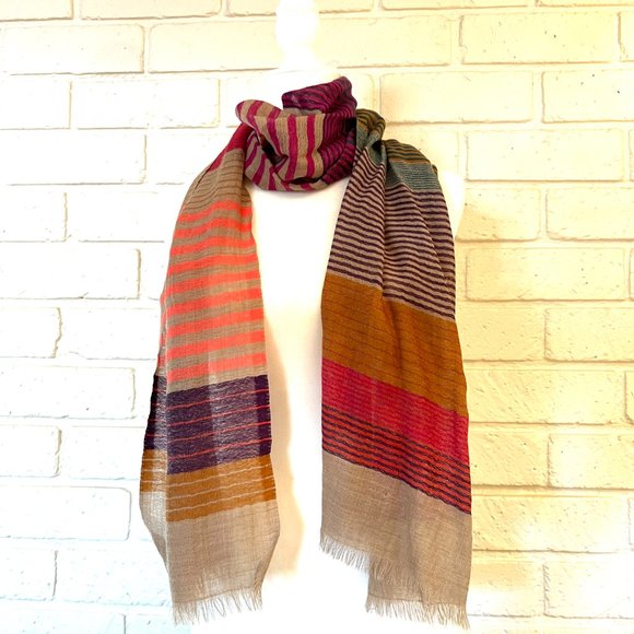Pops of color accent the tan base in this striped print scarf, perfect to knot around the neck for warmth or loosely draped.
