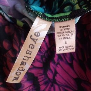 Multicolored top with butterfly-like pattern. Can be worn as shirt or dress. Drapes in back and ties at top. Stretchy, band at bottom, great condition.