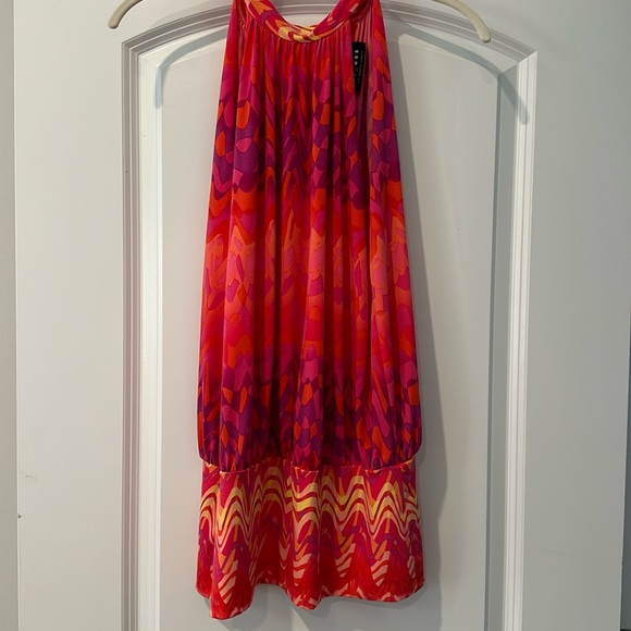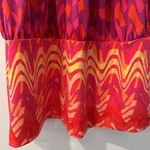 Beautiful multicolored top with flattering neckline ties in the back has a nice band at the bottom looks great with the jeans white pants fit size medium to large there’s no tag with a size but that’s what it is by Liz Claiborne. It’s in great condition.