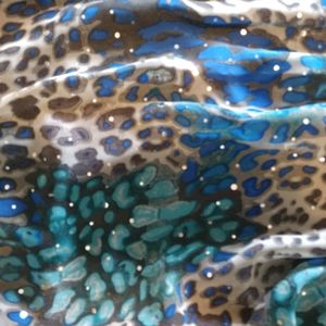 Sheet top with lined bodice. Gray, blue and turquoise. Elastic ruffle at waist, elastic at wrists. Size XL