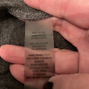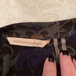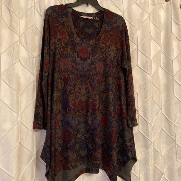 Really pretty tunic. I love the colors in this one. It is long, meant to be worn over tights. The hem is asymetrical. Scoop neck. Long sleeves. Smoke free home.