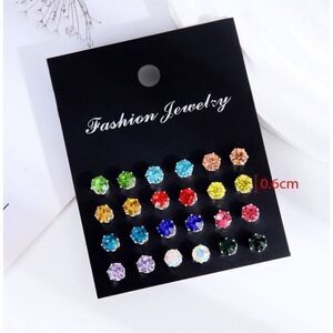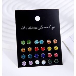 Multicolored Stud pierced earrings accented. There are 12 pairs included with colors as shown in photos. Hypoallergenic posts and are about 1/2 ct to 1 ct in size in silver settings.