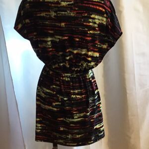 Cute little item that could be worn as a beach coverup, tunic top,or a mini dress. Beautiful colors. Material is polyester. In excellent preowned condition. Measurements are as follows: bust 38”, waist relaxed 24”, hips 32.