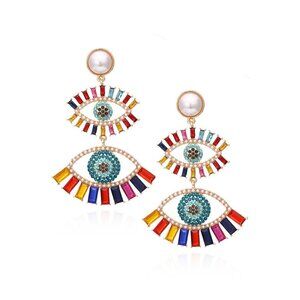 Embody elegance and ward off negative energy with these striking Multilayer Against Evil Eyes Earrings featuring rhinestones, evil eye, and faux pearl. - Exude confidence and style with these Post Back Earrings, measuring approximately 3.5" in length.