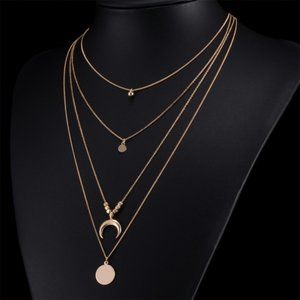 NEW long multilayer bohemian bell, coin, & gold crescent horn necklace