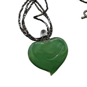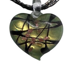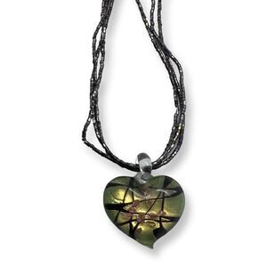 Multilayered Beaded Emerald Murano Glass Heart Pendant Necklace Toggle Clasp