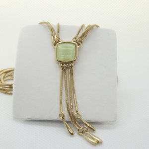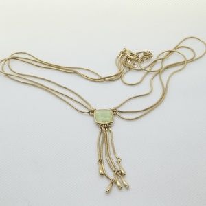 Vintage, multi string gold plated necklace with light green square stone. Necklace is 16 inches long with 2 inches extension (18 inches total). The pendant is 2 inches long.