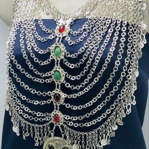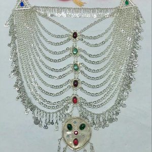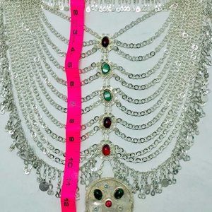 • This extraordinary tribal piece is crafted in a chain style. Each strand of this tribal piece gives vintage vibes. Multihued glass stones are used to make this tribal piece more attractive. It is made up of fine quality metal alloy and covered with rustic silver hues. This traditionally rich tribal necklace is crafted by indigenous of South Asia.