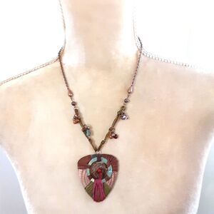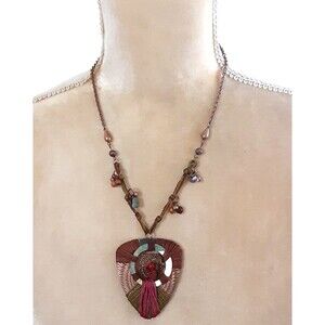Multimedia Boho tribal shield style 2" pendant necklace multicolor 20" long it is signed but I can't read it