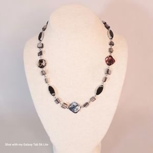 Multimedia Necklace Iridescent Shell Stones Metal Enamel And Glass Beads