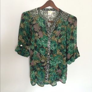 Sheer 100% polyester. High lo top, with fun patterns and flattering shape. Button down front, cuffed sleeves. Light weight, GUC, 23in from shoulder to hem in the front. Longer in back. Size small