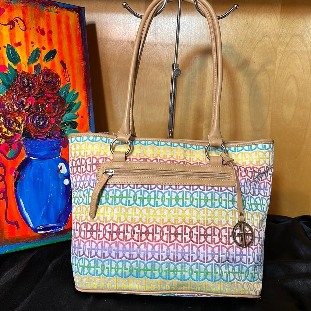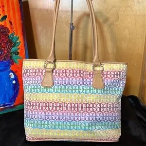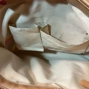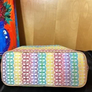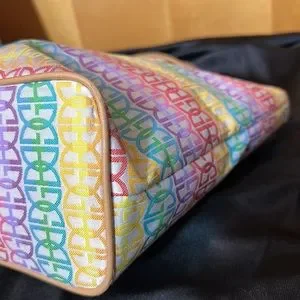 Bright fun! Would match many outfits, especially in spring or summer. Great used condition with signs of wear (stains, some minor cracks on top of handle/along trim, general feel of use). Please zoom in on photos.