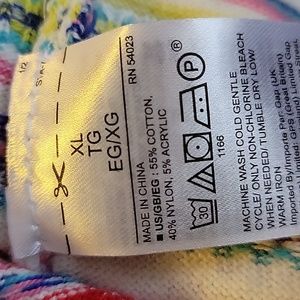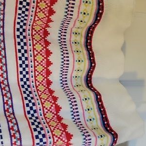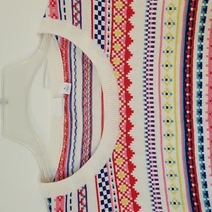Lots of colors and designs on a cream sweater. Colors include red, blue, purple, pink, yellow and turquoise. Cotton, nylon, and acrylic. Size XL. Excellent condition.