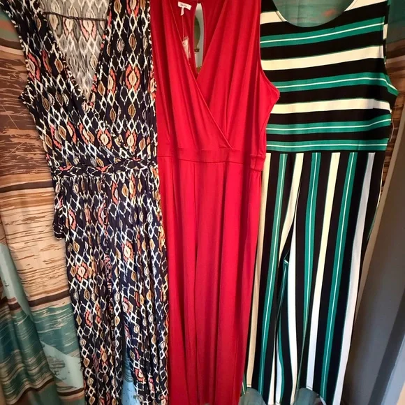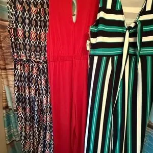 Elegant red sleeveless romper perfect for any occasion. The vibrant color adds a touch of sophistication to your wardrobe. Sleek green black stripe romper will turn heads at any event. Casual blue white orange V front romper is great for a casual event or a workday. All in new condition. Only wore blue one 2 times then lost weight. Other two have tags still on them. Selling individual or will do a group price if interested.