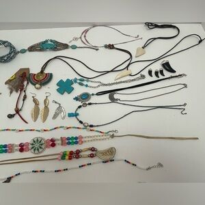 Multiple beaded necklaces, bracelets, and earrings. Can be worn, used for kids dress up or to make other jewelry.