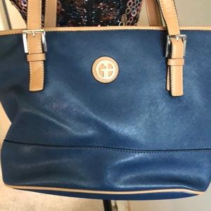 Blue and tan, outside zipper pocket, 3 section interior. Carried ONCE