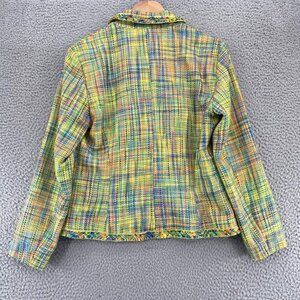 Multiples Blazer Womens Small Green Multi Tweed Plaid Fringe Accent Button Up