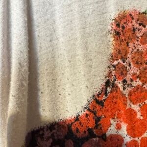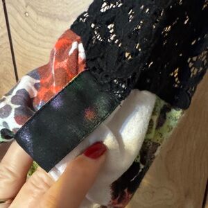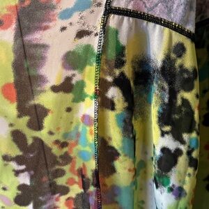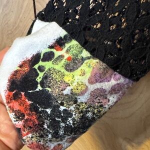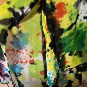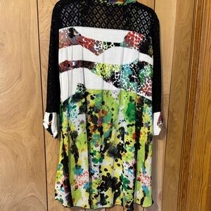 Stylish cardigan with vibrant patterns. Features a mix of green, black, and orange.