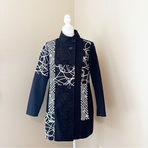 Multiples Embroidered Black White Band Collar Jacket Coat - Medium