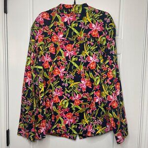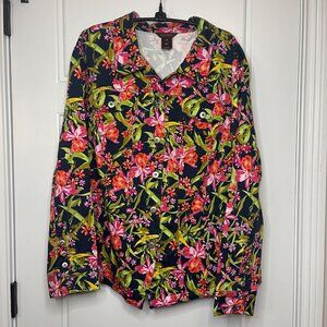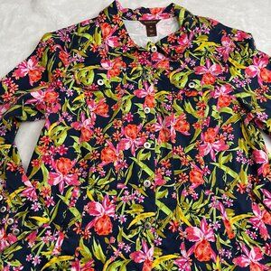 This vibrant floral jacket by Multiples in 1X size is crafted from a comfortable cotton blend. It features a button-up closure and long sleeves, offering a stylish choice for casual outings.