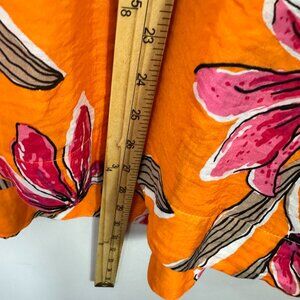 Brighten your wardrobe with this bold tropical floral top by Multiples in size XL. Features a vivid orange backdrop with pink and brown floral prints, a split V-neckline with contrast trim, roll-tab short sleeves, and an elastic hem for shape. Lightweight, airy fabric with a rayon and nylon blend—perfect for summer, vacation, or casual brunch looks.