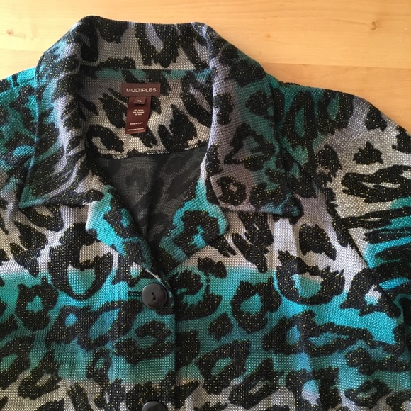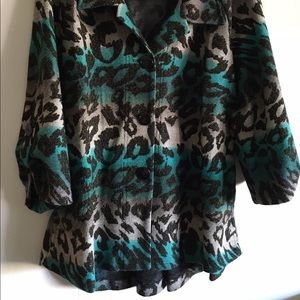Medium weight woven jacket. Front button, high low hem line and gathers in the back makes this fun and have movement! Turquoise tank matches perfectly: for sale separately! Worn once!